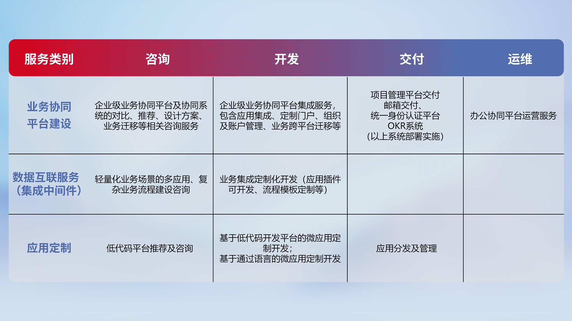 针对钉钉、、、、企微、、IDaas等平台级产品提供产品的规划、、、方案、、交付、、定制化开发等服务,,,实现如统一协同办公、、智能客户服务、、混合会议管理、、智能数据查询、、、等业务场景,,,,实现数字化转型。。。
